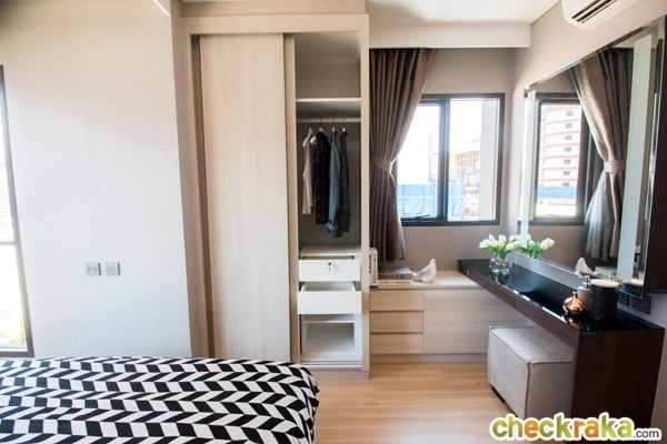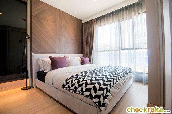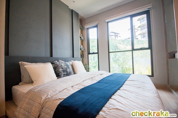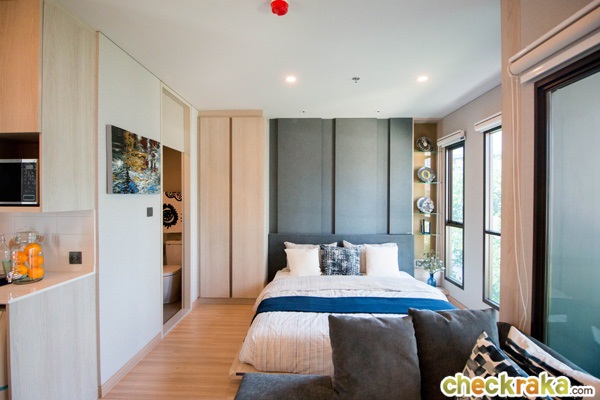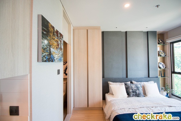 ภายในห้องวางเตียงนอนขนาด 6 ฟุต ไว้ทางฝั่งขวาใกล้กับหน้าต่าง พื้นที่ปลายเตียงประมาณ 40 ซม.