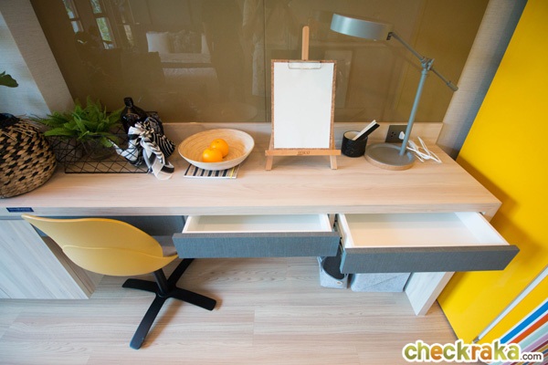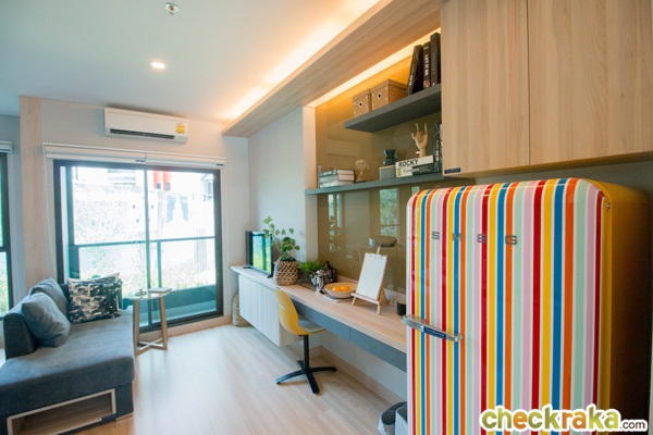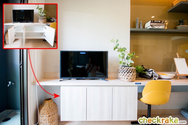 ในโซนห้องนั่งเล่นก็ยังคง Built-in ตู้เก็บของเต็มผนัง และโต๊ะอเนกประสงค์มาให้ดูเป็นตัวอย่างคล้ายกับห้องที่แล้ว