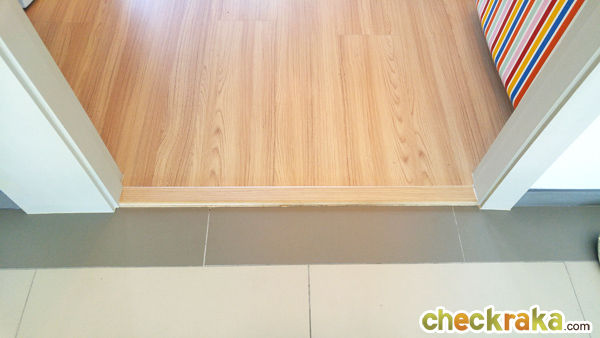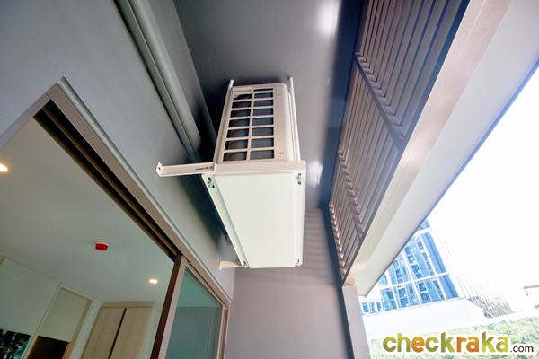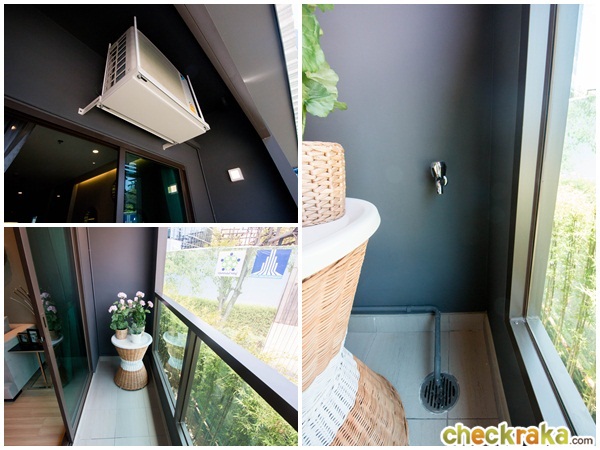 ประตูระเบียงบานเลื่อนแบบ 2 ตอน ด้านนอกเป็นระเบียงซักล้าง คอมเพรสเซอร์แขวนไว้ด้านบนจึงทำให้ไม่ร้อนมาก