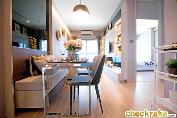 วางโต๊ะทานอาหารได้แบบ 4 ที่นั่ง โดยโครงการเลือกใช้โซฟายาววางชิดผนังเพื่อเป็นการประหยัดพื้นที่