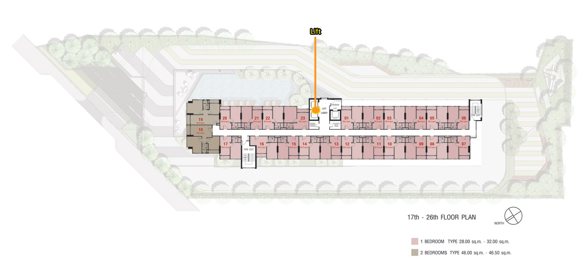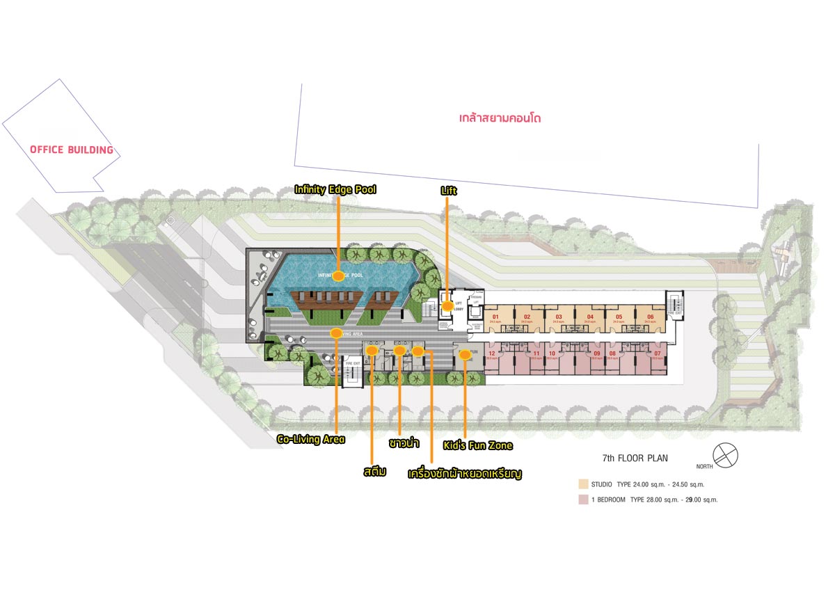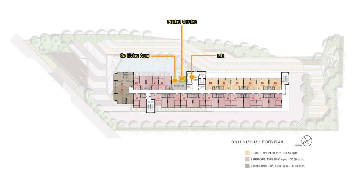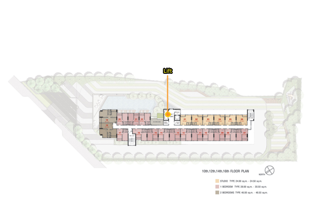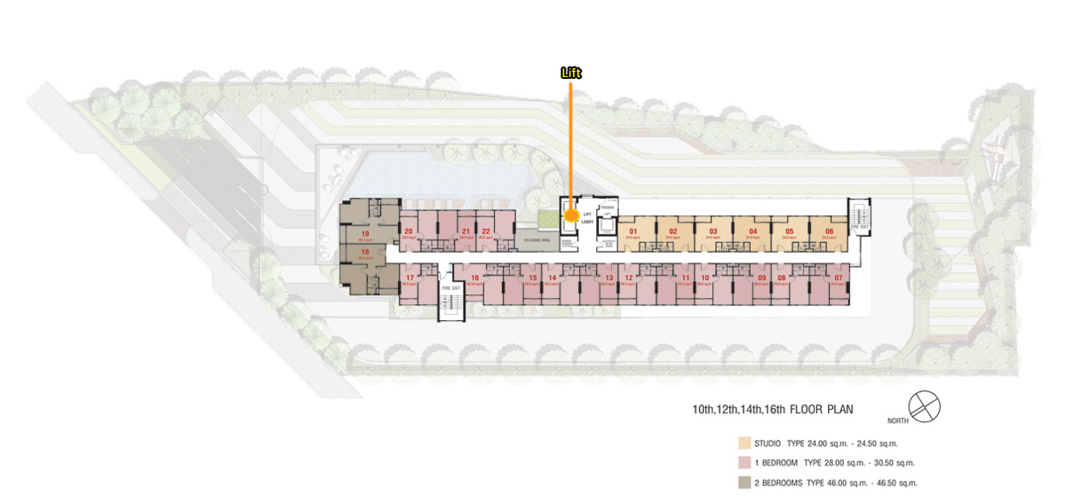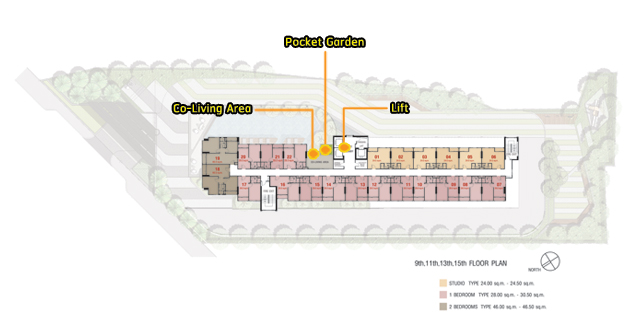 - ห้องชุดพักอาศัย : แบบสตูดิโอ, 1 ห้องนอน และ 2 ห้องนอน ขนาด 24.00 - 46.50 ตร.ม.