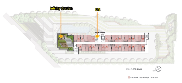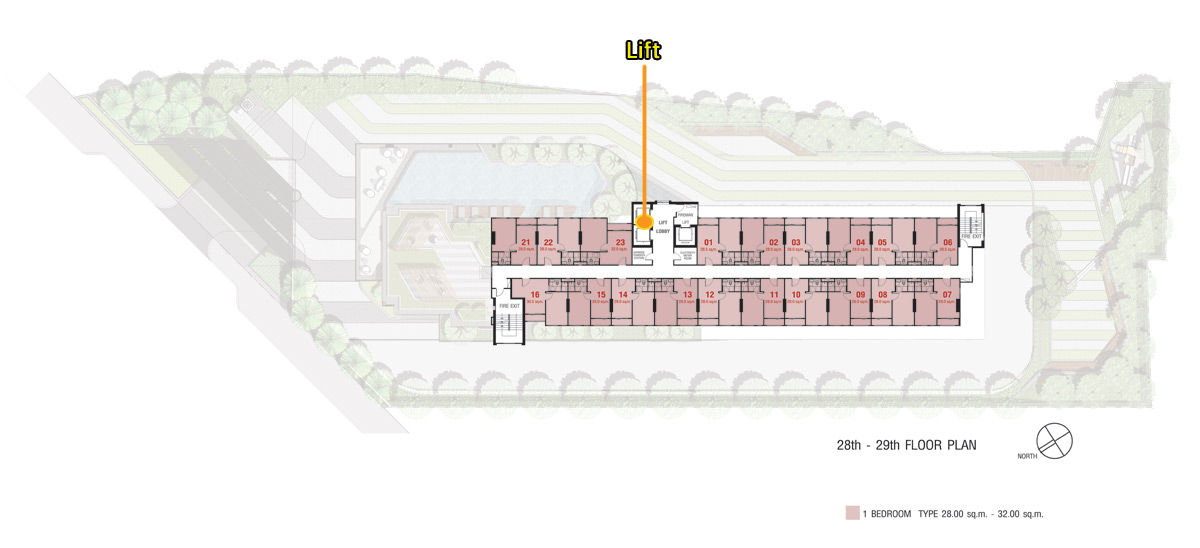 และห้องพักอาศัยทิศตะวันออกในส่วนของชั้น 7 - 16 จะเป็นห้องแบบสตูดิโอทั้งหมด ส่วนชั้น 17 - 29 จะเป็นห้องแบบ 1 ห้องนอนขนาด 28.00 ตร.ม. ทั้งหมดเช่นกัน
