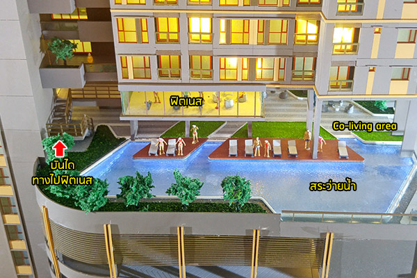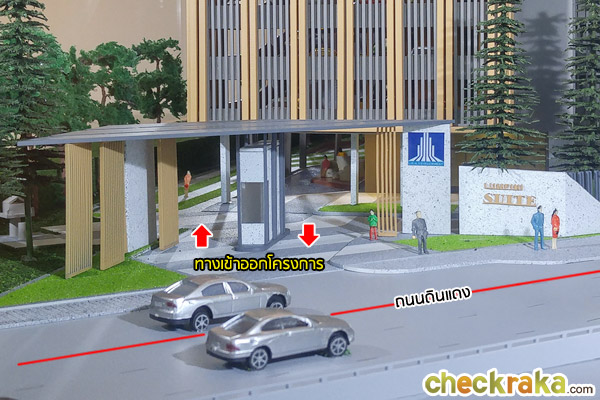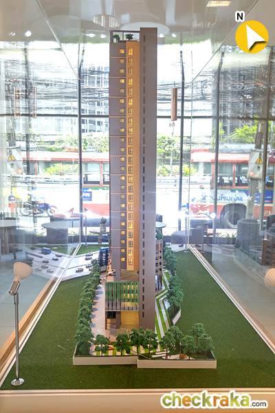 โมเดลอาคารมองจากทิศเหนือติดถนนดินแดง ซึ่งเป็นทางเข้า-ออกทางเดียวของโครงการ