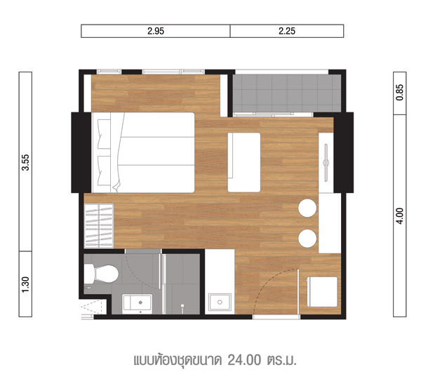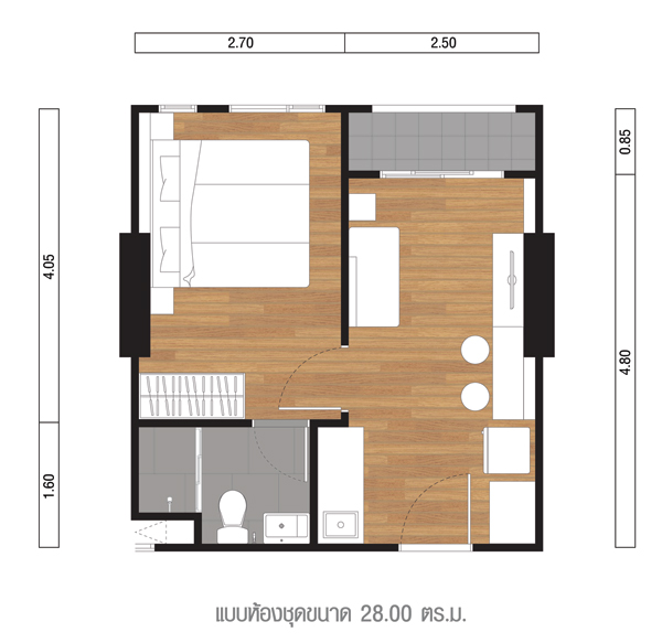 ฟังก์ชั่นการจัดวาง Layout ของห้องขนาด 28.00 ตร.ม. คล้ายกันกับห้องขนาด 24.00 ตร.ม. แต่ว่าห้องนี้จะมีความลึกของห้องมากกว่า โดยมีหน้ากว้าง 5.2 เมตร ลึก 5.65 เมตร