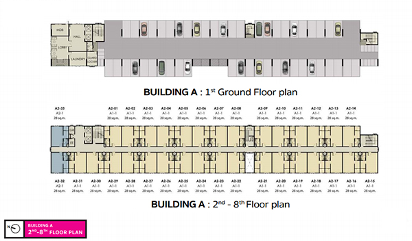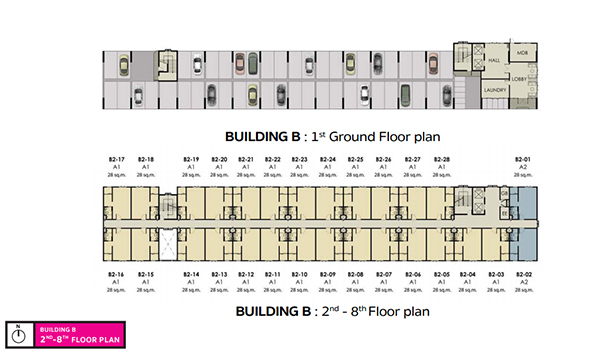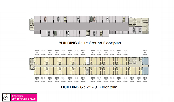 มีที่จอดรถทั้งหมด 634 คัน หรือคิดเป็น 30% ไม่รวมจอดซ้อนคัน ชั้น G ประกอบไปด้วยที่จอดรถ ล็อบบี้ มุมจดหมาย โถงลิฟต์ และห้องวางเครื่องซักผ้า แต่อาคาร H และ I จะไม่มีค่ะ ส่วนชั้น 2-8 เป็นห้องพักอาศัย
