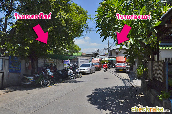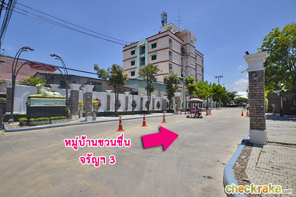 เยื้องกับทางเข้า สน. ท่าพระ เป็นทางเข้าหมู่บ้านชวนชื่น จรัญฯ 3 ค่ะ จุดสังเกตมีรูปปั้นสิงโตหมอบอยู่หน้าโครงการ