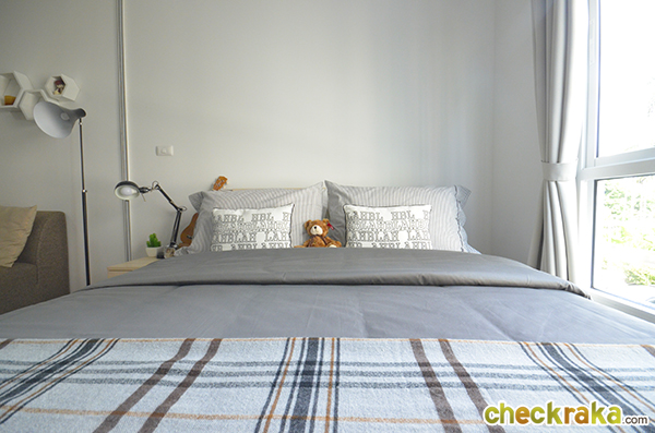 เข้ามาภายในห้องนอนกันบ้าง ทางโครงการจะให้เตียง 5 ฟุตพร้อมฟูก โต๊ะข้างเตียง โต๊ะเครื่องแป้งพร้อมสตูล