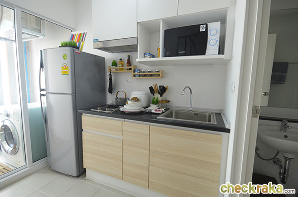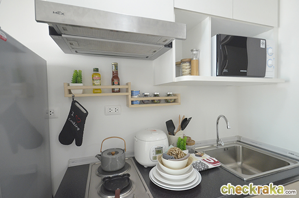 เคาน์เตอร์จะประกอบด้วยเตาไฟฟ้า 2 หัว เครื่องดูดควัน และอ่างล้างจาน