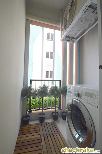 เปิดประตูออกไประเบียงจะเป็นจุดติดตั้งเครื่องซักผ้า ส่วนด้านบนแขวนเครื่องคอมเพรสเซอร์แอร์ค่ะ