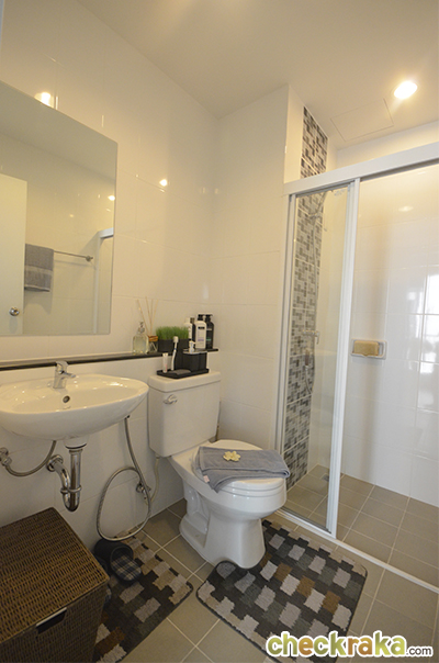ผนังห้องน้ำปูด้วยกระเบื้องจรดเพดาน มี Shower box แยกส่วนเปียก/แห้งให้ด้วยค่ะ