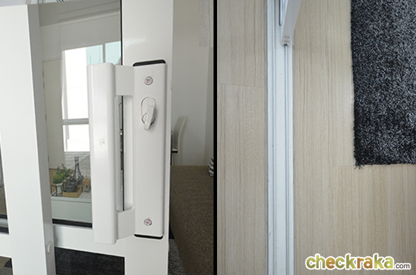 ประตูบานสไลด์ 3 ตอน กั้นห้องนั่งเล่นและห้องนอน หากต้องการความเป็นส่วนตัวสามารถติดม่านหรือ