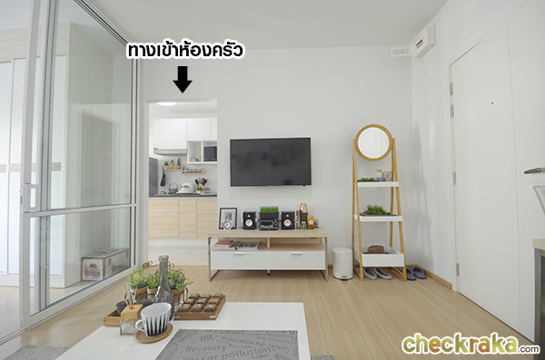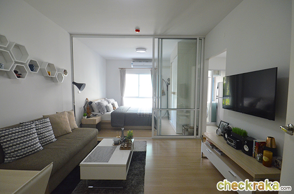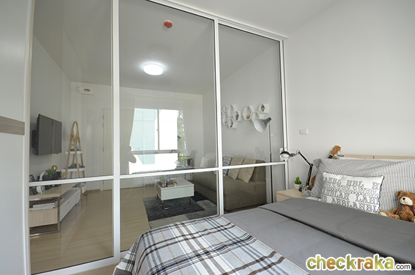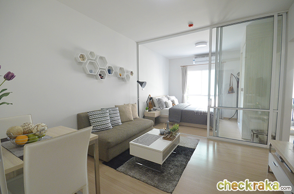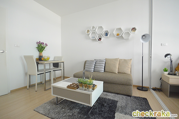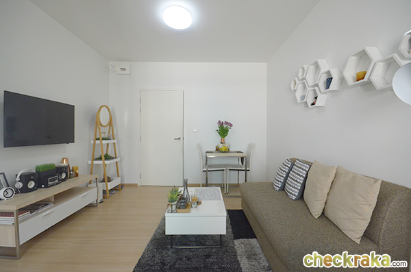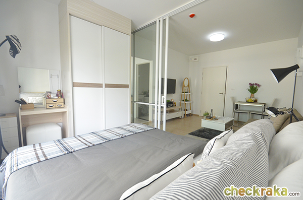 ห้องพักของโครงการนี้เป็นแบบห้อง Studio ทั้งหมด และมีขนาดเดียวคือ 28 ตร.ม. ค่ะ ขายเป็นแบบห้องเปล่า และแบบ Fully Furnished จะได้แอร์ขนาด 18,000 BTU ชุดโต๊ะรับประทานอาหาร โซฟา ชั้นวางโทรทัศน์ เตียง 5 ฟุต+ฟูก โต๊ะเครื่องแป้ง+สตูล ตู้เสื้อผ้า และเคาน์เตอร์ครัว ไปดูในห้องกันเลยค่ะ