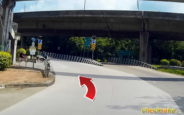 ป้ายสีฟ้าๆ ที่เห็นเป็นป้ายทางด่วนนะคะ ยูเทิร์นรถไม่ไกลก็ขึ้นทางด่วนได้เลยค่ะ