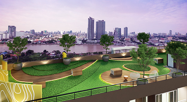 ภาพจำลองสวนบนชั้นดาดฟ้าอาคาร B ที่สามารถมองเห็นวิวแม่น้ำเจ้าพระยา