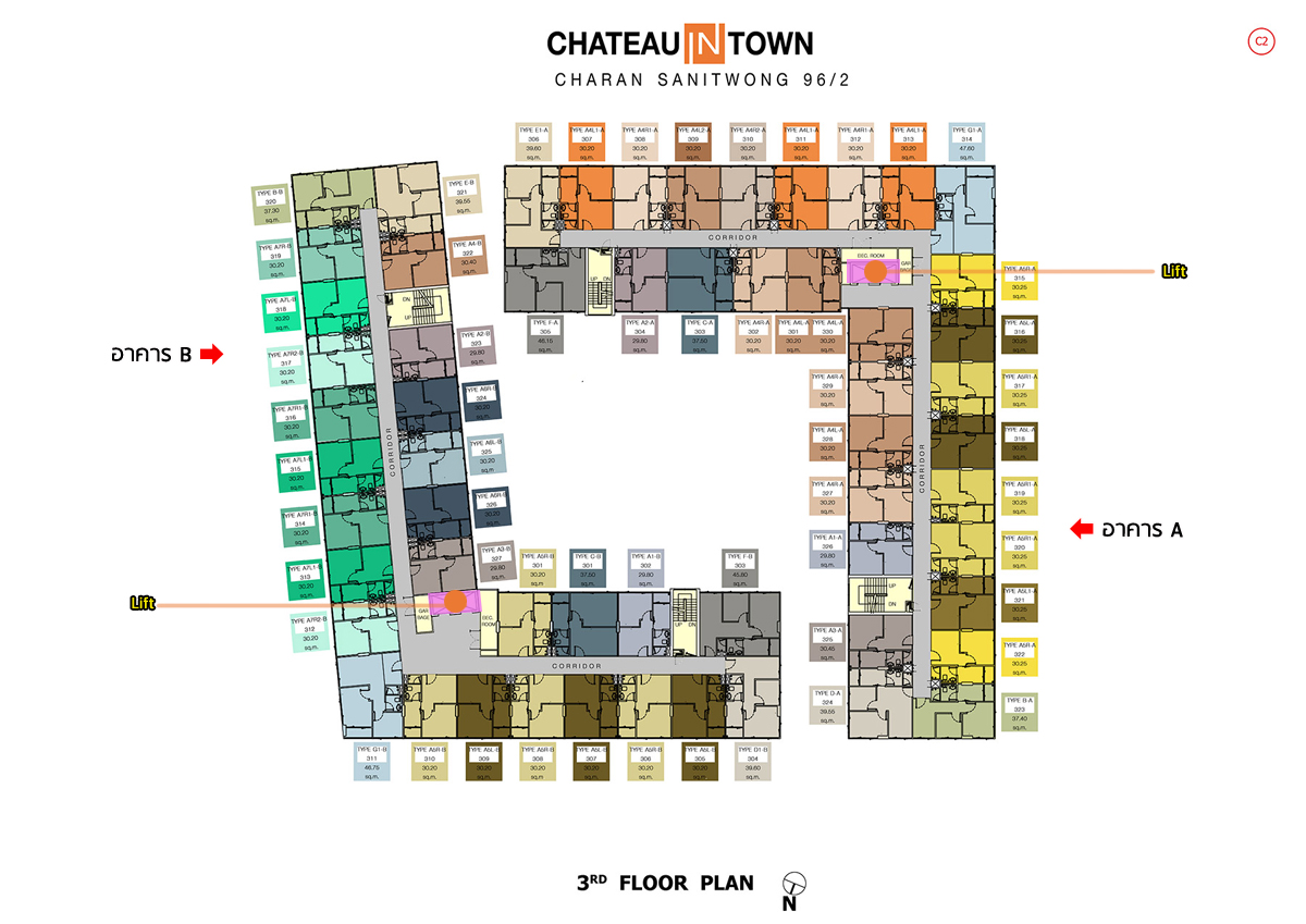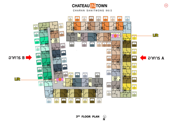 - อาคาร A และ B : แต่ละอาคารประกอบด้วยส่วนของล็อบบี้, ห้องจดหมาย และลิฟต์โดยสาร 1 ตัว