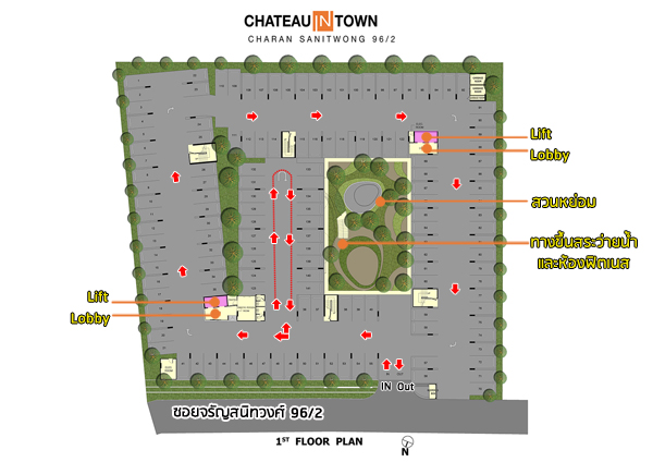 ส่วนการเดินรถภายในโครงการจะเป็นแบบเดินรถทางเดียว (one-way) โดยจากประตูทางเข้าโครงการขับผ่านไม้กระดกเข้ามาแล้วจะให้เลี้ยวทางซ้ายวิ่งลอดใต้อาคาร B วิ่งวนเป็นวงกลมแล้วกลับมาออกที่หน้าโครงการ