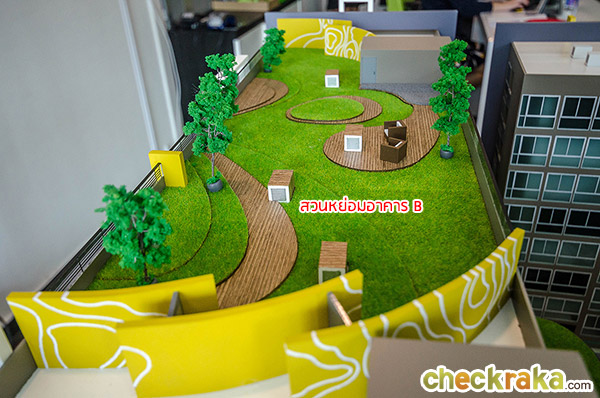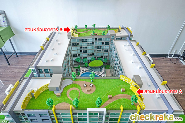 - สวนหย่อมพักผ่อนที่ชั้น 1, ชั้นดาดฟ้าอาคาร A อาคาร B และอาคารสระว่ายน้ำ