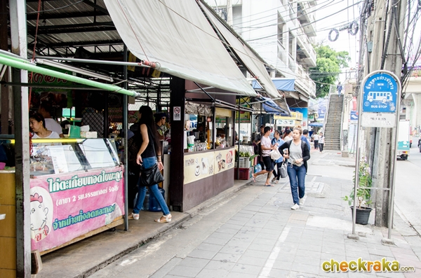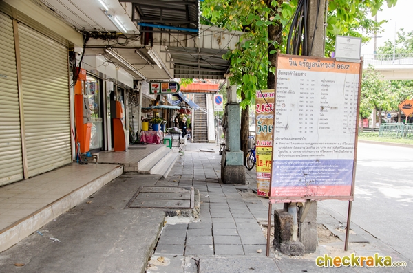 ตรงนี้มีป้ายรถเมล์ และมีตลาด อาหารคาวหวานมากมายเลยค่ะ