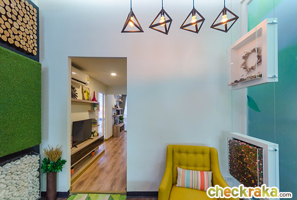 ระยะดูทีวีของห้องนี้ประมาณ 2 เมตร ผนัง ผนังติดวอลล์เปเปอร์ให้สีตามแบบห้องตัวอย่าง