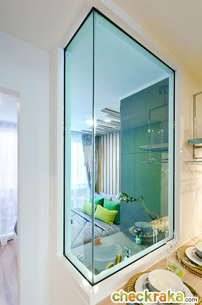 กระจกสีเขียวใส สามารถเปิดประตูตรงจุดนี้เพื่อช่วยถ่ายเทอากาศ และช่วยระบายกลิ่นเวลาทำอาหารได้ดี