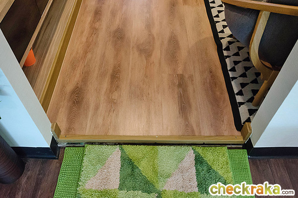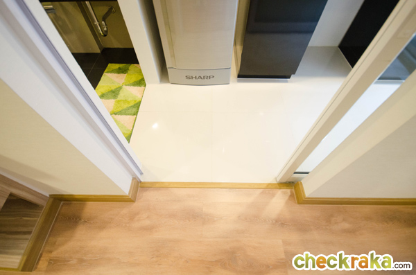 เข้าไปดูในห้องครัวกันต่อค่ะ ระหว่างพื้นห้องครัวกับห้องนั่งเล่นจบด้วยลามิเนต ห้องครัวกั้นด้วยประตูบานเลื่อน
