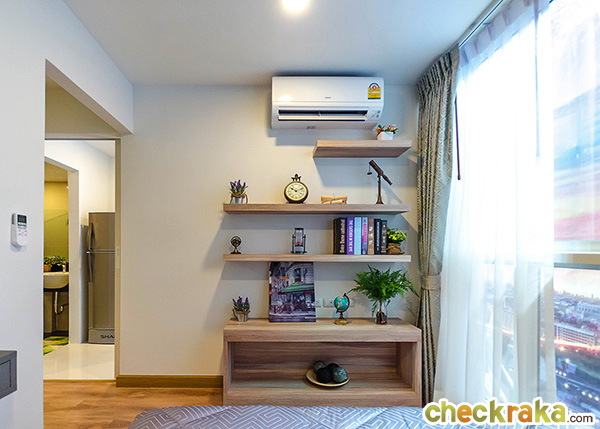 ผนังปลายเตียง Built-in เป็นชั้นวางของ พร้อมติดตั้งเครื่องปรับอากาศขนาด 12,000 BTU ของ Hitachi มาให้