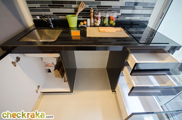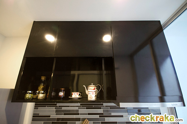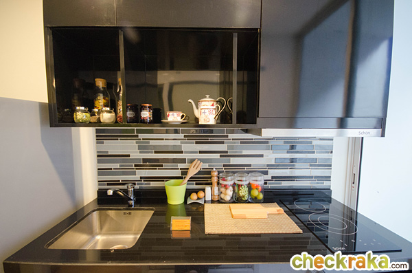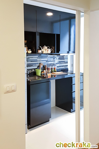 ได้ชุดครัวสำเร็จรูปสีดำ พื้นห้องครัวปูด้วยกระเบื้องแกรนิตโต้ ขนาด 60x60 ซม. ในห้องครัวได้ไฟดาวน์ไลท์ 2 ดวง