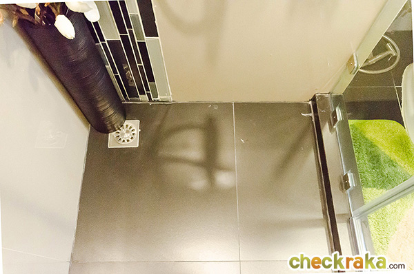 พื้นห้องน้ำลดระดับลงประมาณ 3 ซม. ไม่มีธรณีก่อให้ ข้อดีคือไม่ต้องระวังว่าจะเดินสะดุด