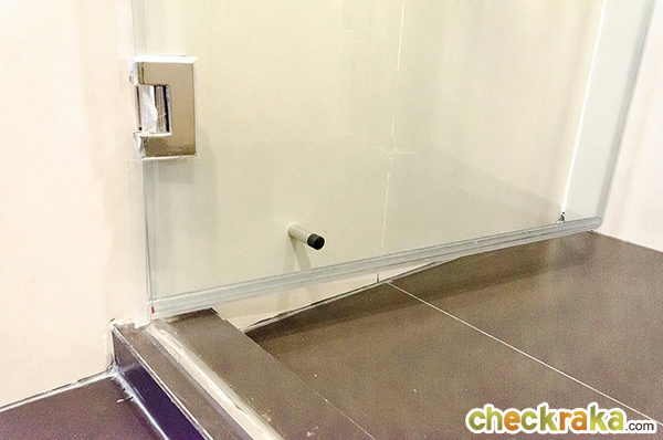 ฉากกั้นอาบน้ำเป็นกระจก Tempered Glass ยกธรณีสูง 6 ซม. ด้านหลังประตูมีตัวกันกระแทกมาให้