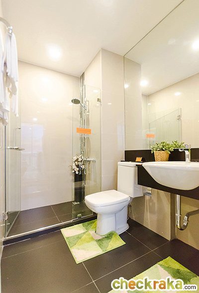 ภายในห้องน้ำแบ่งการใช้งานส่วนแห้งและส่วนเปียกไว้อย่างชัดเจน พื้นห้องน้ำปูด้วยกระเบื้องแกรนิตโต้ ขนาด 60x60 ซม.
