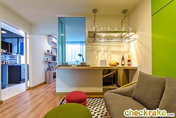 อีกมุมของห้องนั่งเล่นออกแบบเป็นโต๊ะไม้ติดผนังยาวตลอดแนวผนังที่ทางโครงการให้มา นอกจากจะประหยัดพื้นที่แล้วยังสามารถทำเป็นโต๊ะทานอาหาร หรือจะเป็นมุมทำงานก็ได้ เพียงแค่หาเก้าอี้ตัวเล็กๆ มาตั้งเพิ่มนิดหน่อยแค่นี้ก็โอเคแล้ว แต่บาร์ที่แขวนแก้วไม่ได้นะคะ ส่วนผนังตรงจุดนี้จะเชื่อมต่อกับส่วนของห้องนอน