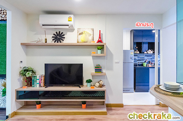 เข้าประตูห้องมาซ้ายมือ Built-in เป็นชั้นวางทีวีมาให้ พร้อมชั้นวางของเหนือทีวี ยกเว้นเครื่องปรับอากาศไม่ได้นะคะ