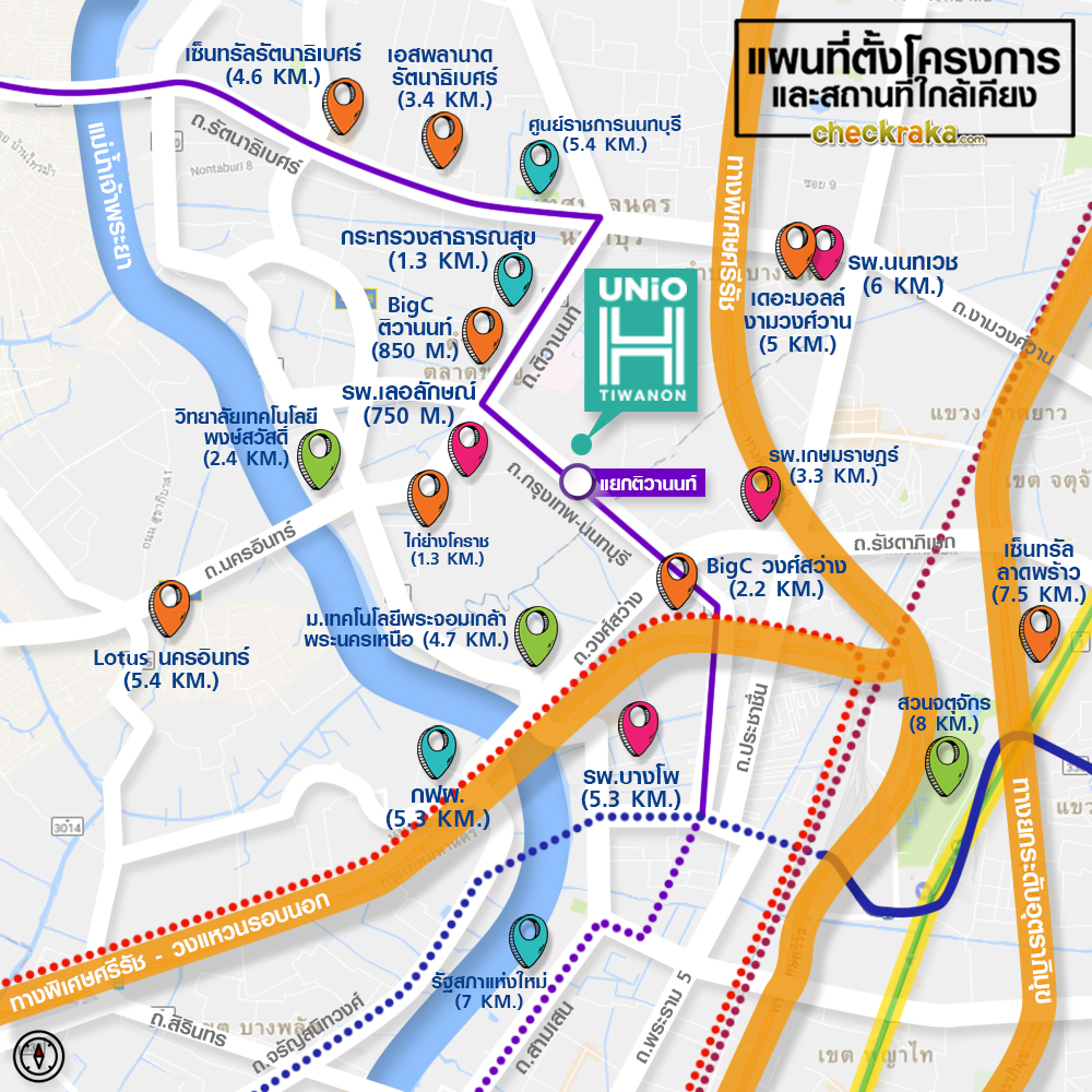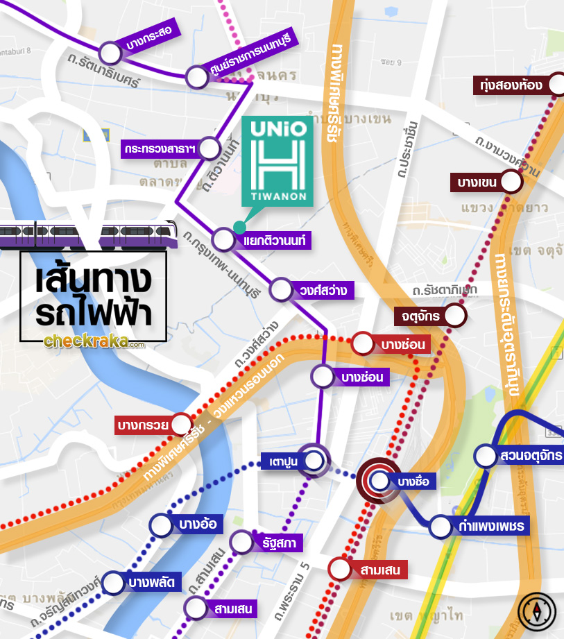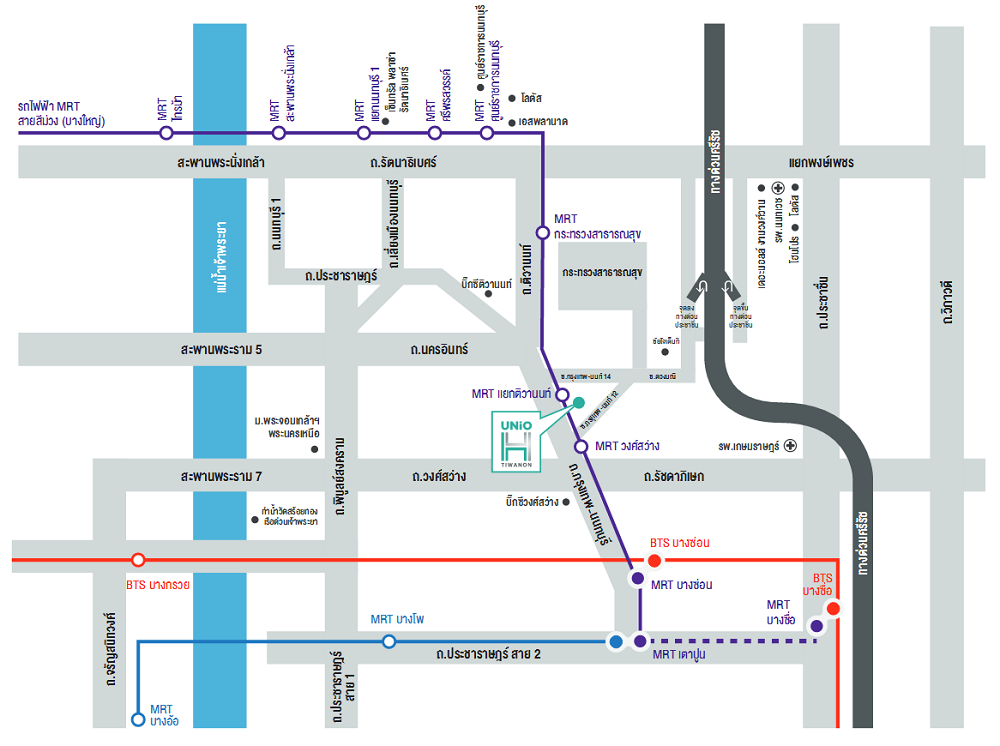 เส้นทางรถไฟฟ้าได้ขยายตัวมารอบนอกกรุงเทพฯ สายแรกที่เปิดให้บริการเมื่อมิถุนายน 2559 ที่ผ่านมา คือ รถไฟฟ้าสายสีม่วง ช่วงบางใหญ่-เตาปูน มี 16 สถานีด้วยกันนะคะ ระยะทางอยู่ที่ 23 กิโลเมตร ค่าโดยสารเริ่มต้นที่ 14-42 บาทค่ะ ซึ่งรางรถไฟฟ้าจะทอดยาวไปตามถนนกรุงเทพ-นนทบุรี (ผ่านที่ตั้งโครงการ Unio H Tiwanon) ถนนติวานนท์ แล้วเลี้ยวซ้ายไปตามถนนรัตนาธิเบศร์ ข้ามแม่น้ำเจ้าพระยา ใกล้ๆ สะพานพระนั่งเกล้า แล้วเลี้ยวขวาไปยังถนนกาญจนาภิเษก จุดสุดท้ายของรถไฟฟ้าสายสีม่วงสิ้นสุดที่สถานีคลองบางไผ่
