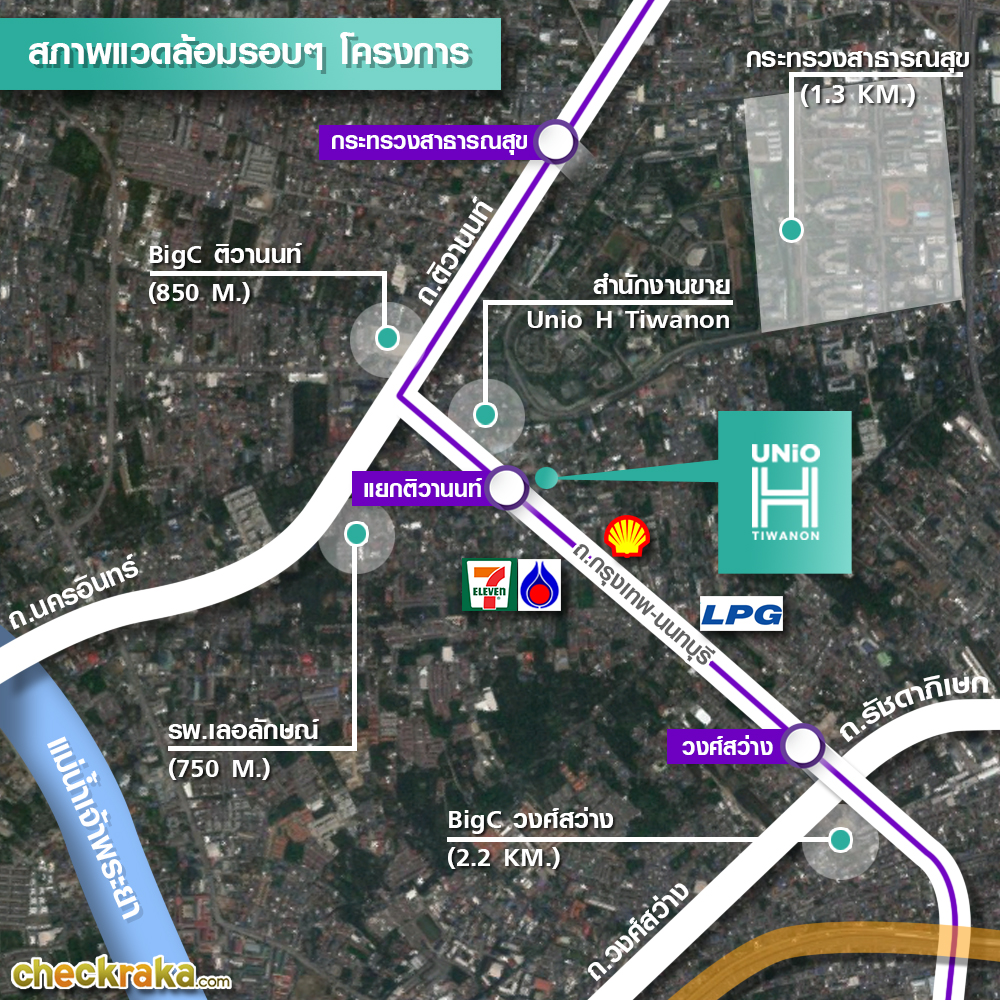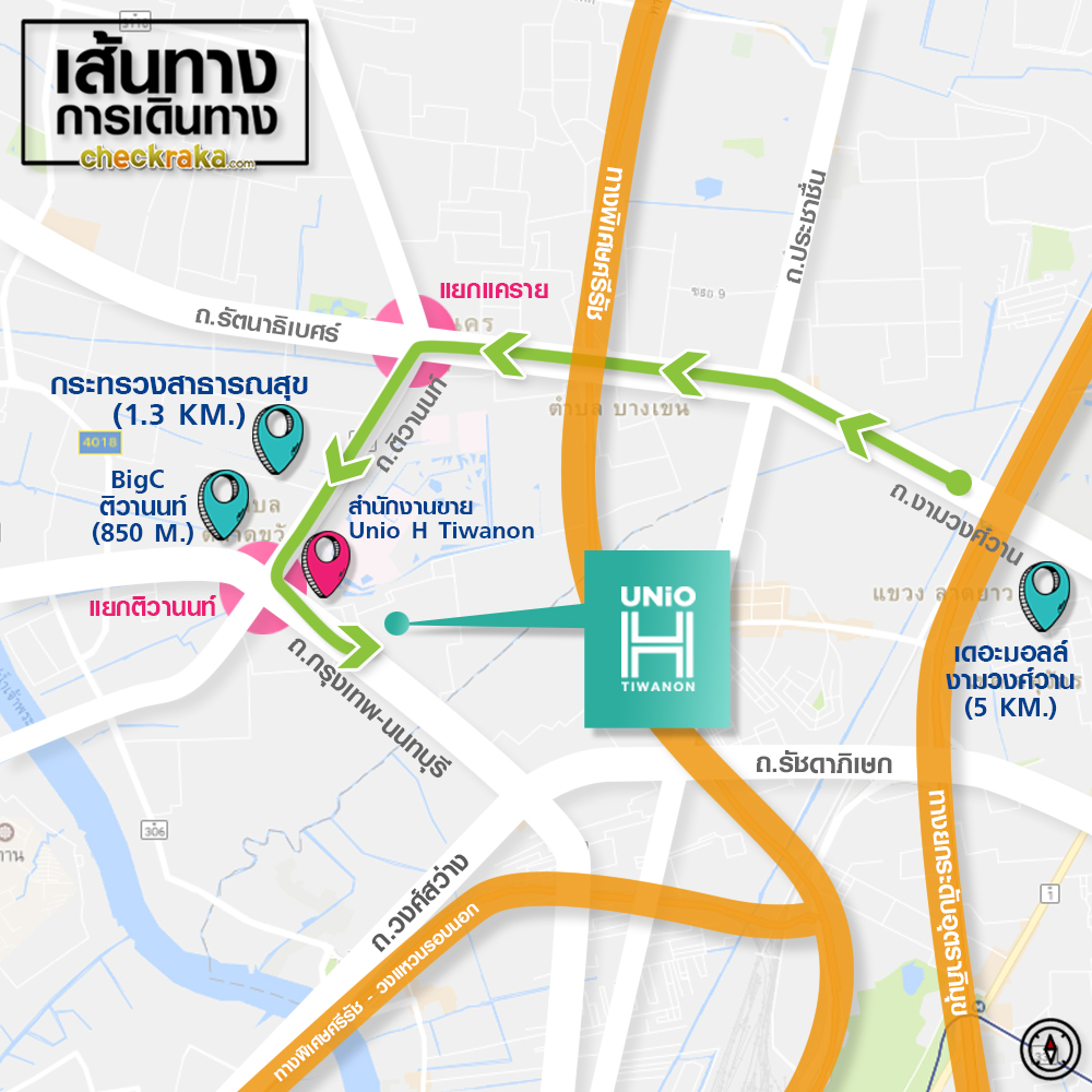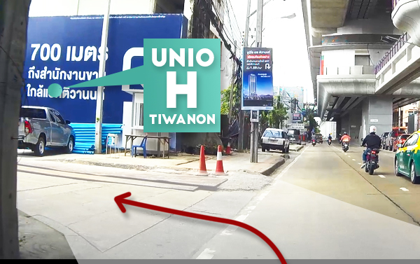 จากแยกติวานนท์มาถึงสำนักงานขายโครงการ Unio H Tiwanon ประมาณ 100 ม. เลี้ยวซ้ายได้เลยค่ะ