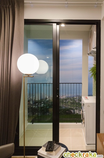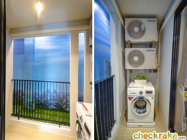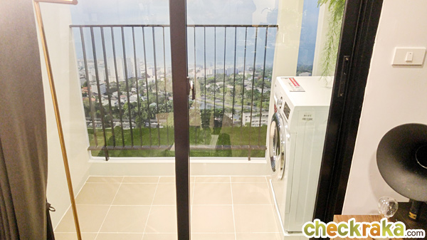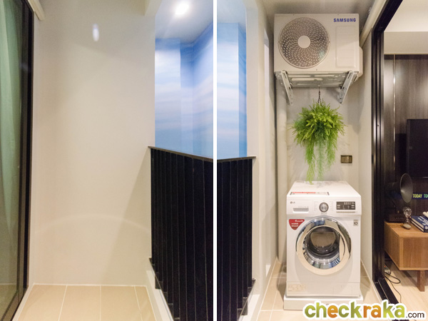 เครื่องซักผ้าวางไว้ทางฝั่งขวาของระเบียง มีก๊อกน้ำสแตนเลสมาให้ 1 อัน ผนังได้ปลั๊กกันน้ำ