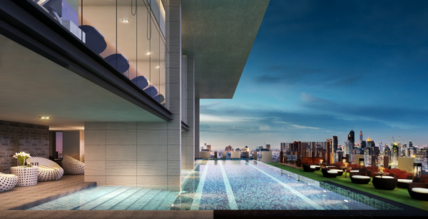 - พื้นที่พักผ่อนริมสระว่ายน้ำ หันหน้าเข้าหาถนนใหญ่