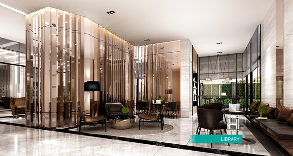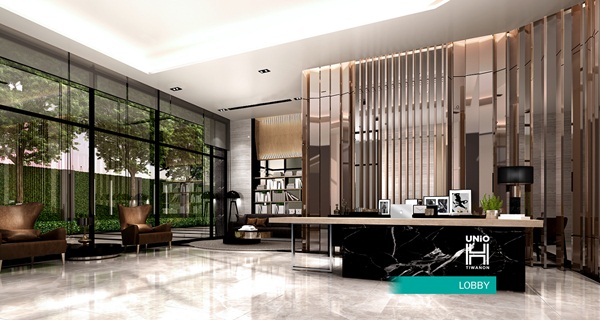 ภาพจำลองบรรยากาศล็อบบี้ ซึ่งมีพื้นที่ขนาด 200 ตร.ม. แบบ Double Volume ความสูง 3.5 เมตร