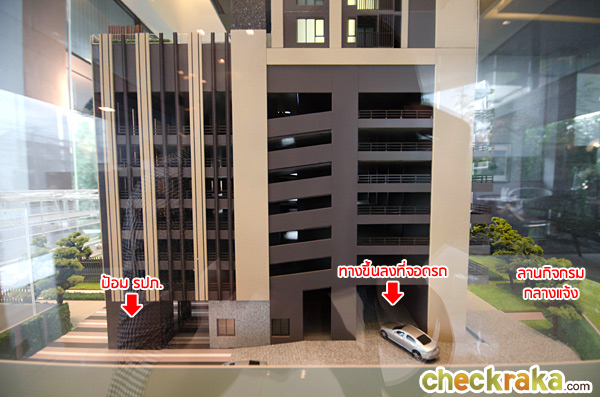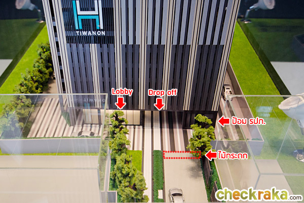 จากถนนขับเข้าโครงการมาจะมีไม้กระดกกั้น มีจุด Drop off อยู่ด้านหน้าบริเวณทางเข้า Lobby