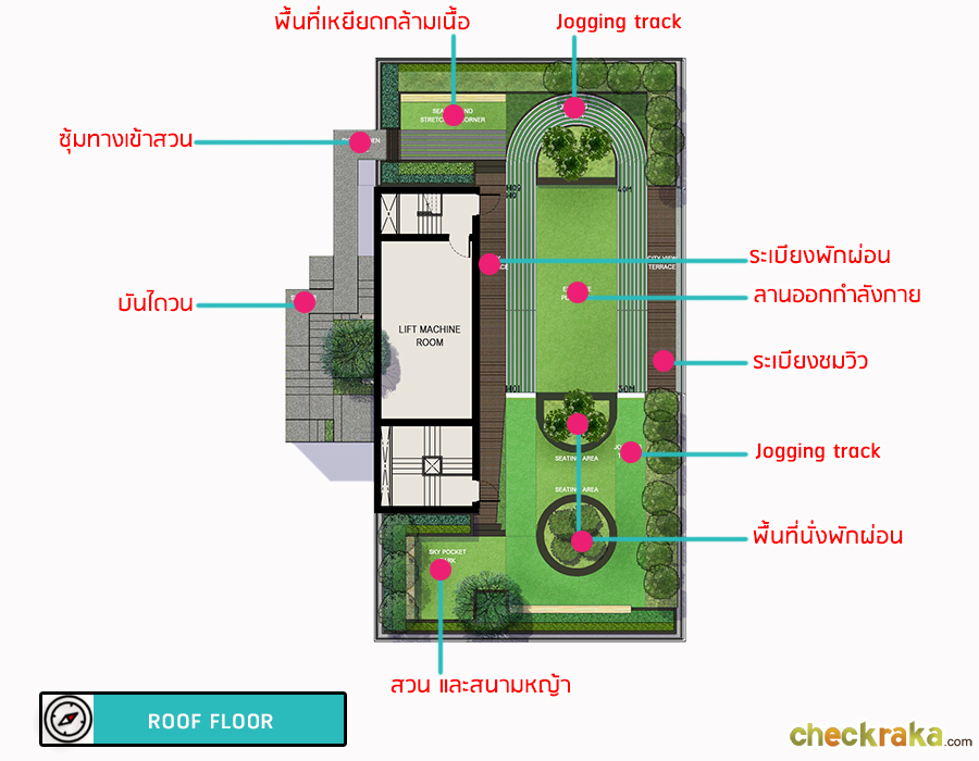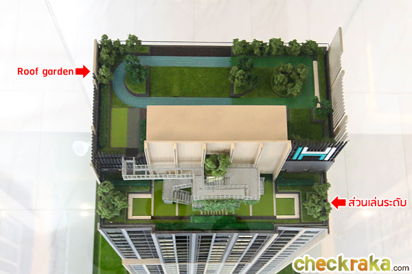 ชั้นดาดฟ้า : เป็นสวนส่วนกลาง อาทิ Jogging Track ความยาว 50 เมตร, พื้นที่นั่งเล่นพักผ่อน และสนามหญ้า