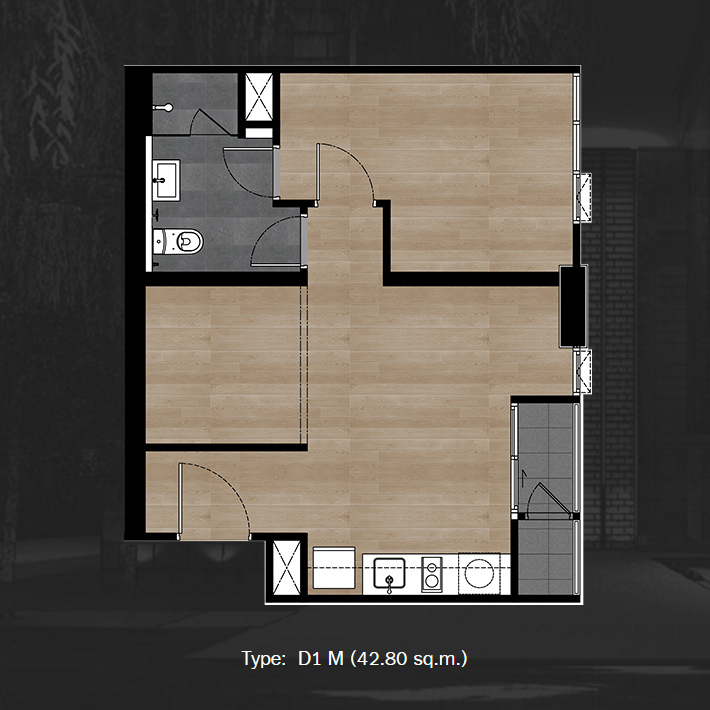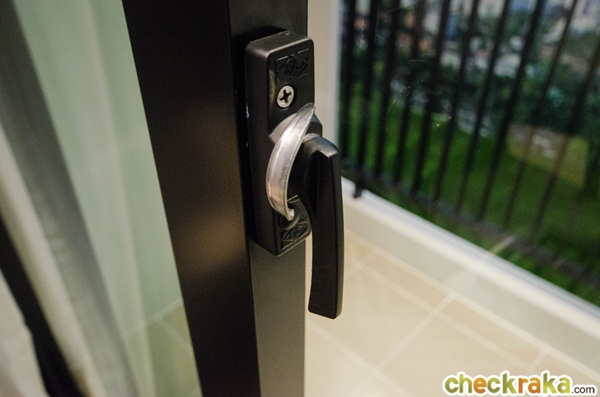 โดยประตูฝั่งห้องครัวเป็นประตูไม้สังเคราะห์แบบบานสไลด์ ส่วนฝั่งห้องนอนเป็นประตูบานสวิงเปิดเข้าด้านในมือจับก้านโยก