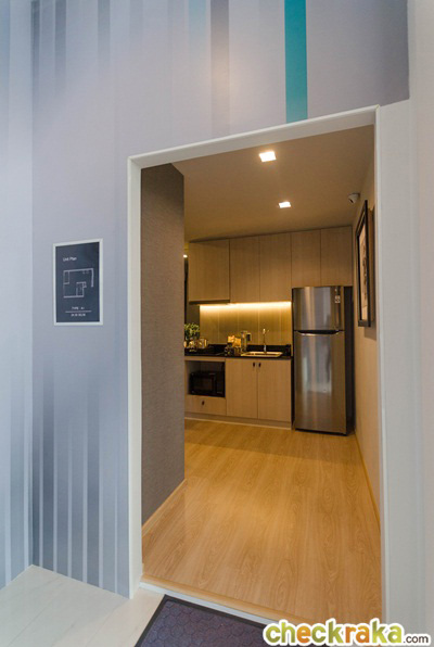 จากประตูห้องมองเข้ามาทางขวาจะเป็นส่วนของห้องครัว เชื่อมต่อกับห้องนั่งเล่น และทางซ้ายจะเป็นห้องนอนกับห้องน้ำ