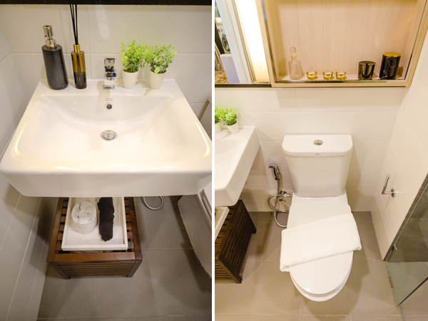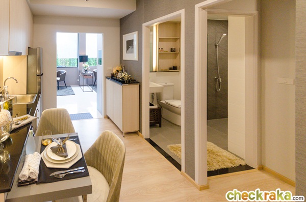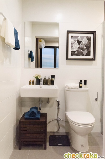 ตรงข้ามเคาน์เตอร์ครัวจะเป็นที่ตั้งของตู้วางรองเท้า และห้องน้ำแบบ Double Access ที่เข้าออกได้ 2 ทาง ทั้งจากทางห้องนอน และจากห้องครัว เพิ่มความเป็นส่วนตัวให้กับเจ้าของห้องเวลาที่เพื่อนมาจะได้ไม่ต้องเดินผ่านไปในส่วนของห้องนอน