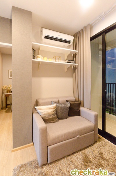 ได้เครื่องปรับอากาศ 1 ตัวที่ห้องนั่งเล่น ห้องจริงจะไม่มีเสาแบบนี้นะคะ จะเป็นผนังเรียบสามารถวางโซฟาได้ขนาด 2 ที่นั่ง