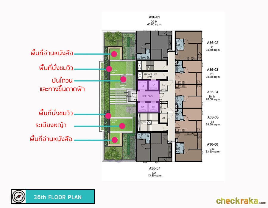 ชั้น 36 จะจัดเป็นสวน เป็นเลานจ์ สำหรับให้ลูกบ้านมานั่งพักผ่อน อ่านหนังสือ มีบันไดวนสำหรับเดินขึ้นไปที่ชั้นดาดฟ้า ซึ่งชั้นดาดฟ้าจะมีลานกิจกรรมต่างๆ อาทิ Jogging Track เป็นวงกลมความยามประมาณ 50 เมตร และ พื้นที่สำหรับยืดกล้ามเนื้อ ลานออกกำลังกาย ระเบียงสำหรับชมวิว พื้นที่นั่งเล่นพักผ่อน สวนและสนามหญ้า ซึ่งบนชั้นนี้สามารถเทควิวได้ 180 องศา โดยถ้าเริ่มวิ่งจากบันไดบนแล้วไปต่อที่ Jogging Track จะรวมระยะทางได้ประมาณ 250 เมตร เรียกว่าได้เหงื่อกันเลยทีเดียว