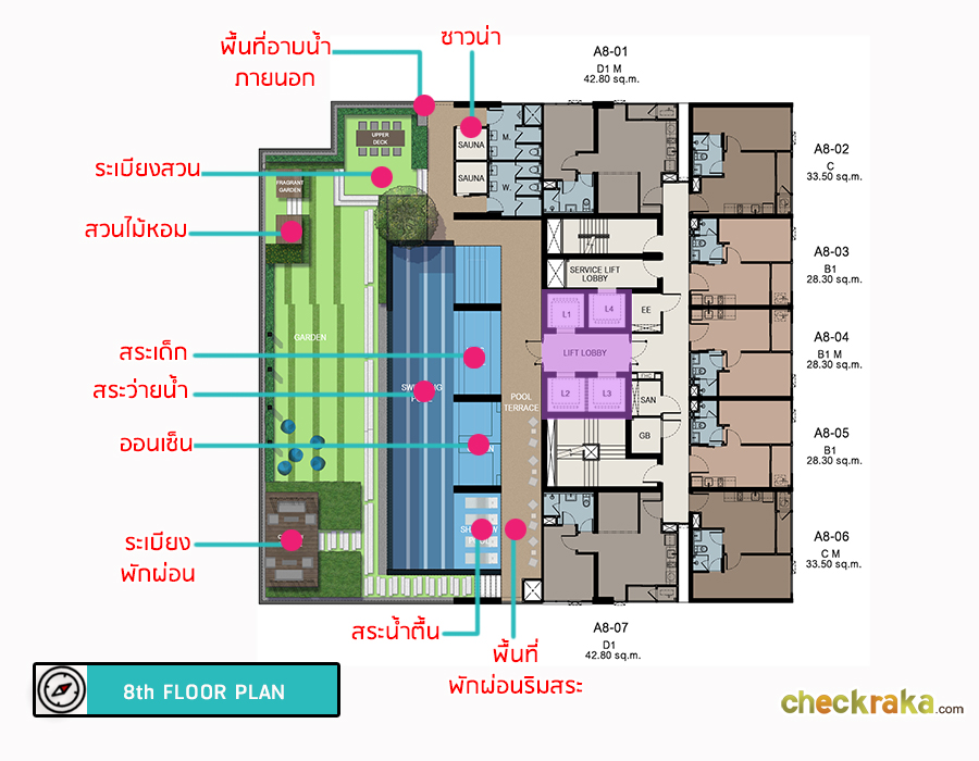 ชั้น 8 : ประกอบด้วยส่วนพักอาศัย และส่วนกลาง ระหว่างโซนพักอาศัยกับส่วนกลางจะมีระบบรักษาความปลอดภัย เข้าออกด้วยระบบคีย์การ์ด เข้าได้เฉพาะลูกบ้านที่พักอาศัยชั้นนี้เท่านั้น ชั้นนี้มีห้องชุดพักอาศัยทั้งหมด 7 ยูนิต แบ่งเป็นห้องขนาด 28.30 ตร.ม. ห้องขนาด 33.50 ตร.ม. และห้องขนาด 42.80 ตร.ม. ส่วนกลางของชั้นนี้ก็มีสระว่ายน้ำ ออนเซ็น และพื้นที่สวนพักผ่อน