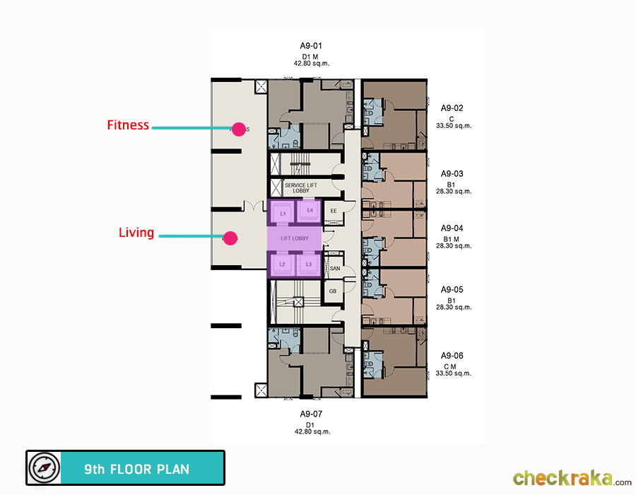 ชั้น 9 : เป็นชั้นของห้องฟิตเนส และห้องพักอาศัยอีก 7 ยูนิต แบ่งเป็นห้องขนาด 28.30 ตร.ม. ห้องขนาด 33.50 ตร.ม. และห้องขนาด 42.80 ตร.ม.