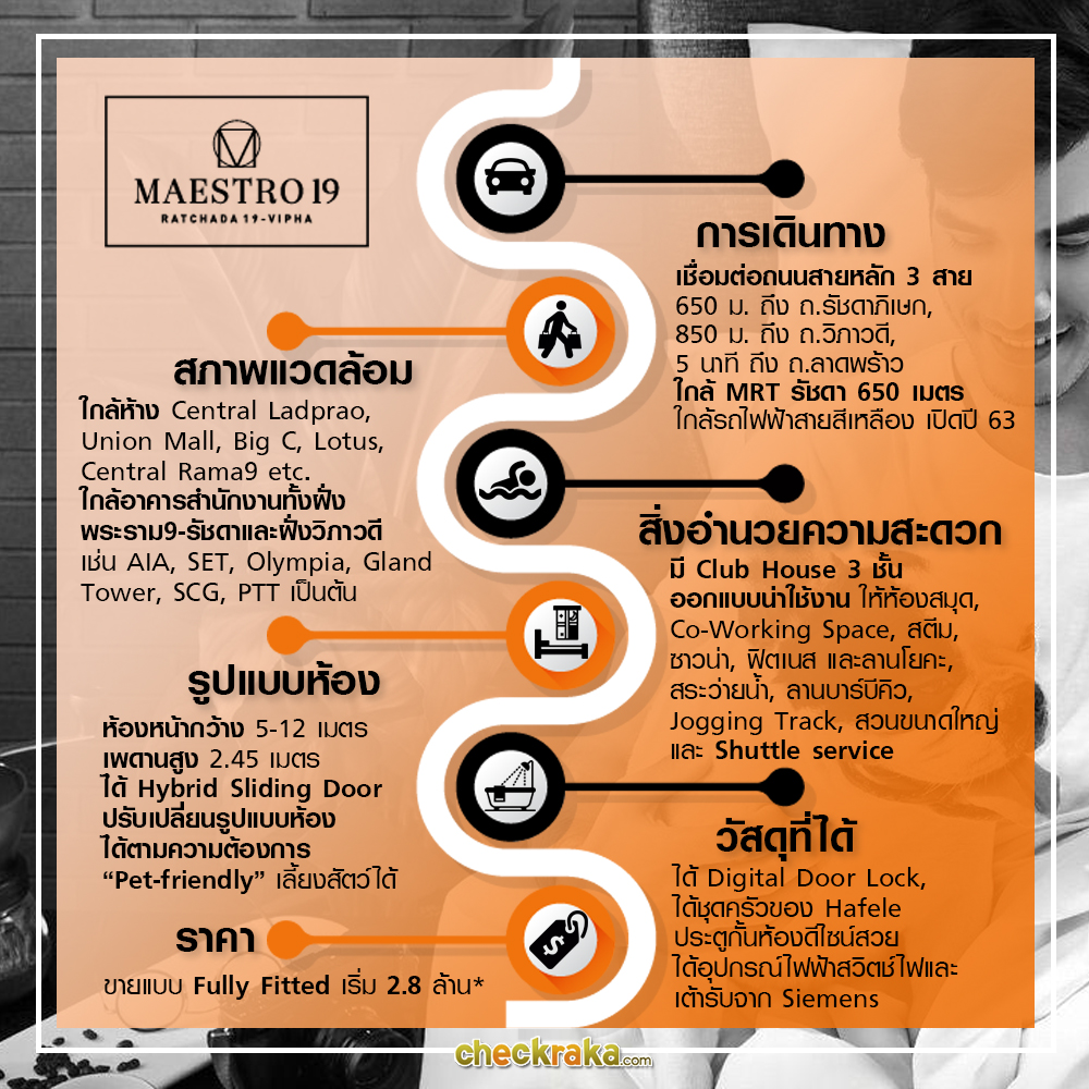 วันนี้ CheckRaka.com จะพาไปทุกท่านไปเยี่ยมชมโครงการ มาเอสโตร 19 รัชดา 19 - วิภา (MAESTRO 19 Ratchada19 - Vipha) จากบริษัท เมเจอร์ ดีเวลลอปเม้นท์ จำกัด (มหาชน) ถือเป็นโครงการที่ 8 ในกลุ่มมาเอสโตร เรสซิเดนซ์ โดยยังคงเป็นคอนโด Low-rise ในสไตล์ "Classic Inspired, Modern Twist" ที่มีความคลาสสิกผสมผสานกับความเป็นโมเดิร์นเช่นเคย โดยโครงการนี้ออกแบบมาภายใต้คอนเซปต์ "อินดัสเตรียล เอลลิแกนท์" (Industrial Elegance) เดินทางสะดวกสบายเพียง 650 เมตรถึงสถานี MRT รัชดาภิเษก พร้อมบริการรถรับ-ส่งจากโครงการ นอกจากนี้ยังเอาใจคนรักสัตว์ โดยสามารถเลี้ยงสัตว์ได้อย่างถูกต้องไม่ต้องหลบซ่อน (Pet friendly) อีกด้วย โครงการนี้จะมีความน่าสนใจอย่างไรตามไปชมกันค่ะ