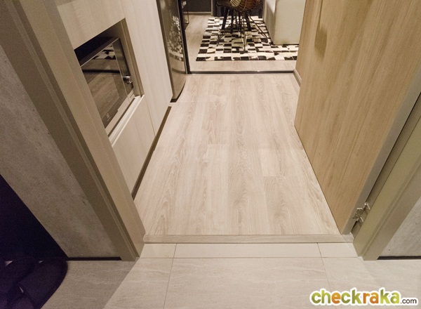 ส่วนพื้นห้องได้เป็นลามิเนตหนา 8 มม. ส่วนตัวจบประตูหน้าห้องเป็นลามิเนตเช่นกัน