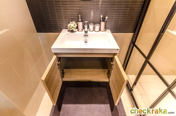 ได้อ่างล้างหน้ารูปทรงสี่เหลี่ยมของ LAVENZ ด้านล่างมีตู้สำหรับเก็บของ ก๊อกน้ำของ Hafele