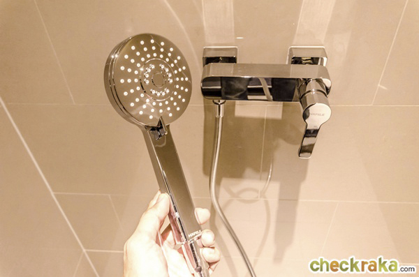 ฝักบัวสายอ่อนทรงกลมของ Hafele มีช่องสำหรับวางอุปกรณ์อาบน้ำเหมือนห้องที่แล้ว